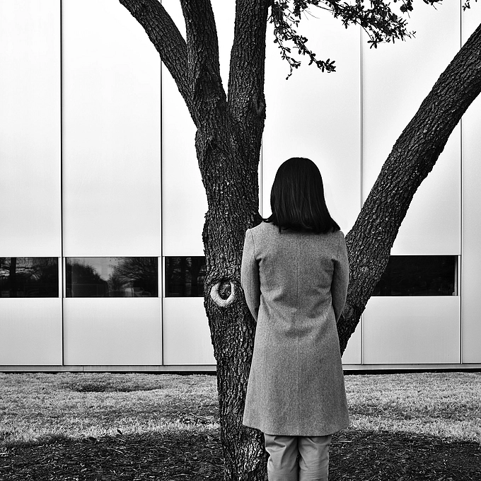 Person and Live Oak in front of The Modern